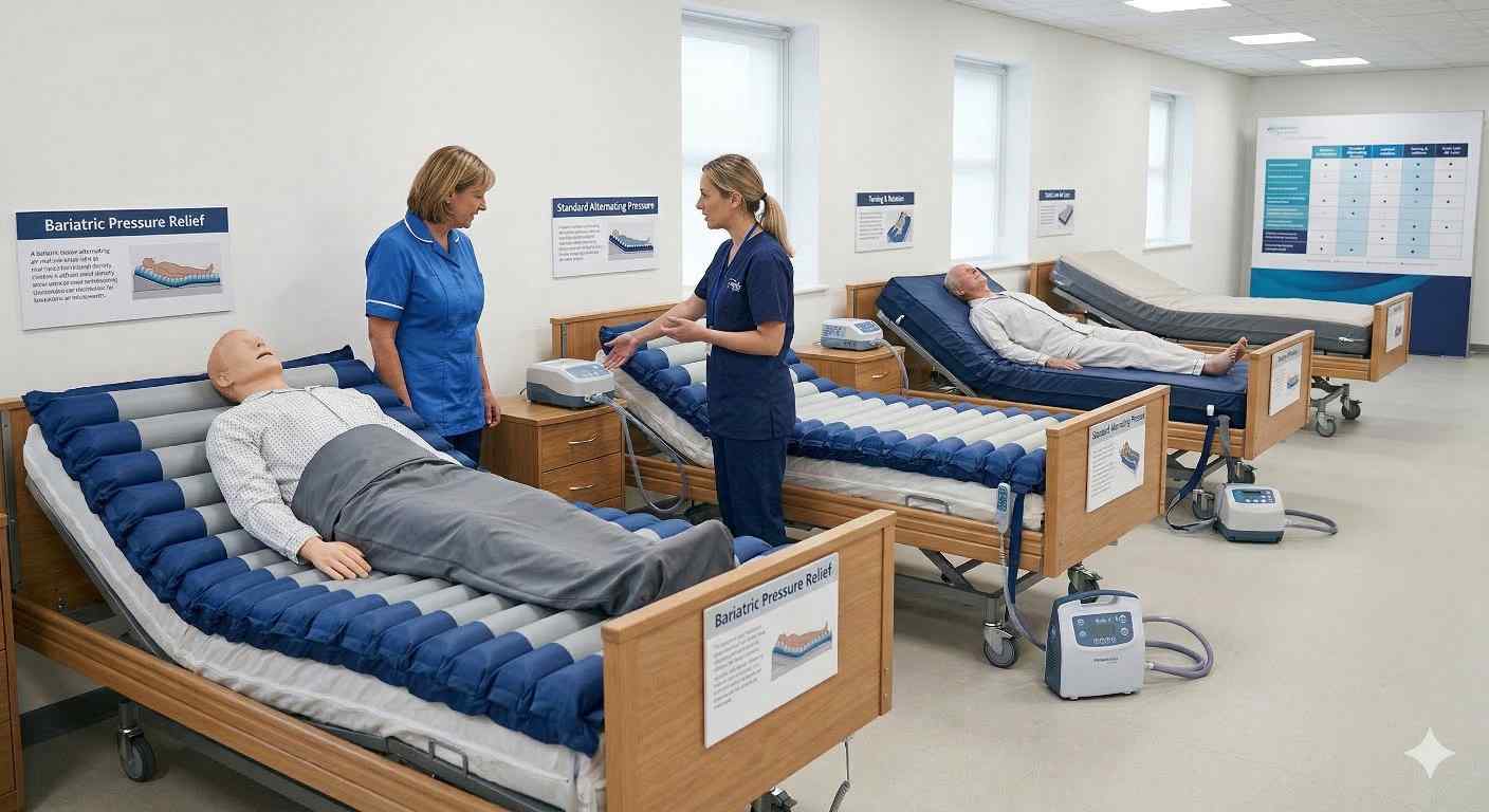 Bir medikal eğitim ve ürün showroom alanında, farklı şişme basınç önleyici şilte modellerinin sergilendiği bir dizi hastane yatağı. İki sağlık personeli ayakta duruyor; bir hemşire diğerine bir kontrol ünitesini gösteriyor. Yataklarda bariatrik ve standart hasta maketleri yatıyor. Arka planda "Bariatric Pressure Relief" ve "Standard Alternating Pressure" gibi metinlerin olduğu bilgilendirme levhaları ve karşılaştırma posteri görülüyor.